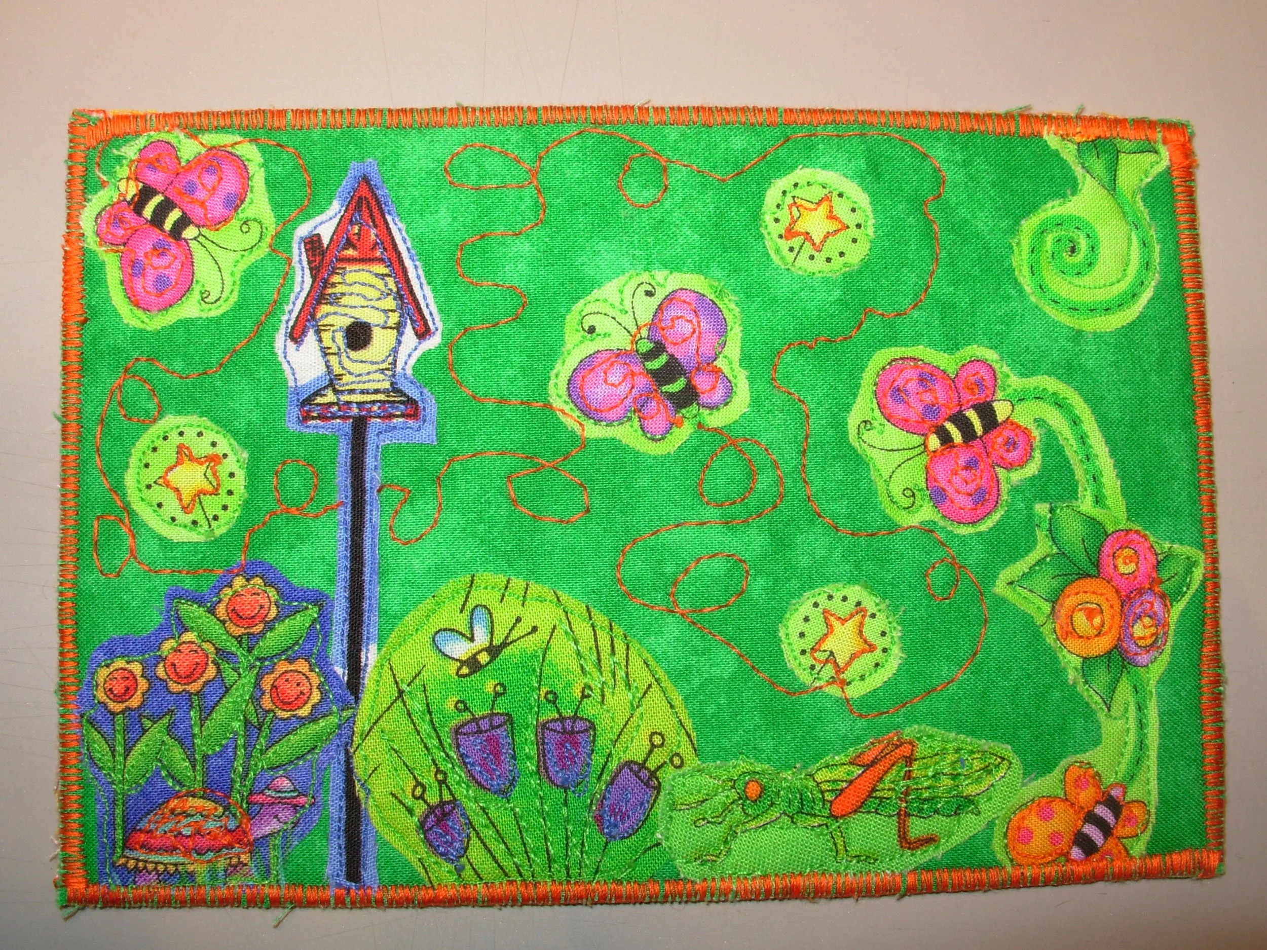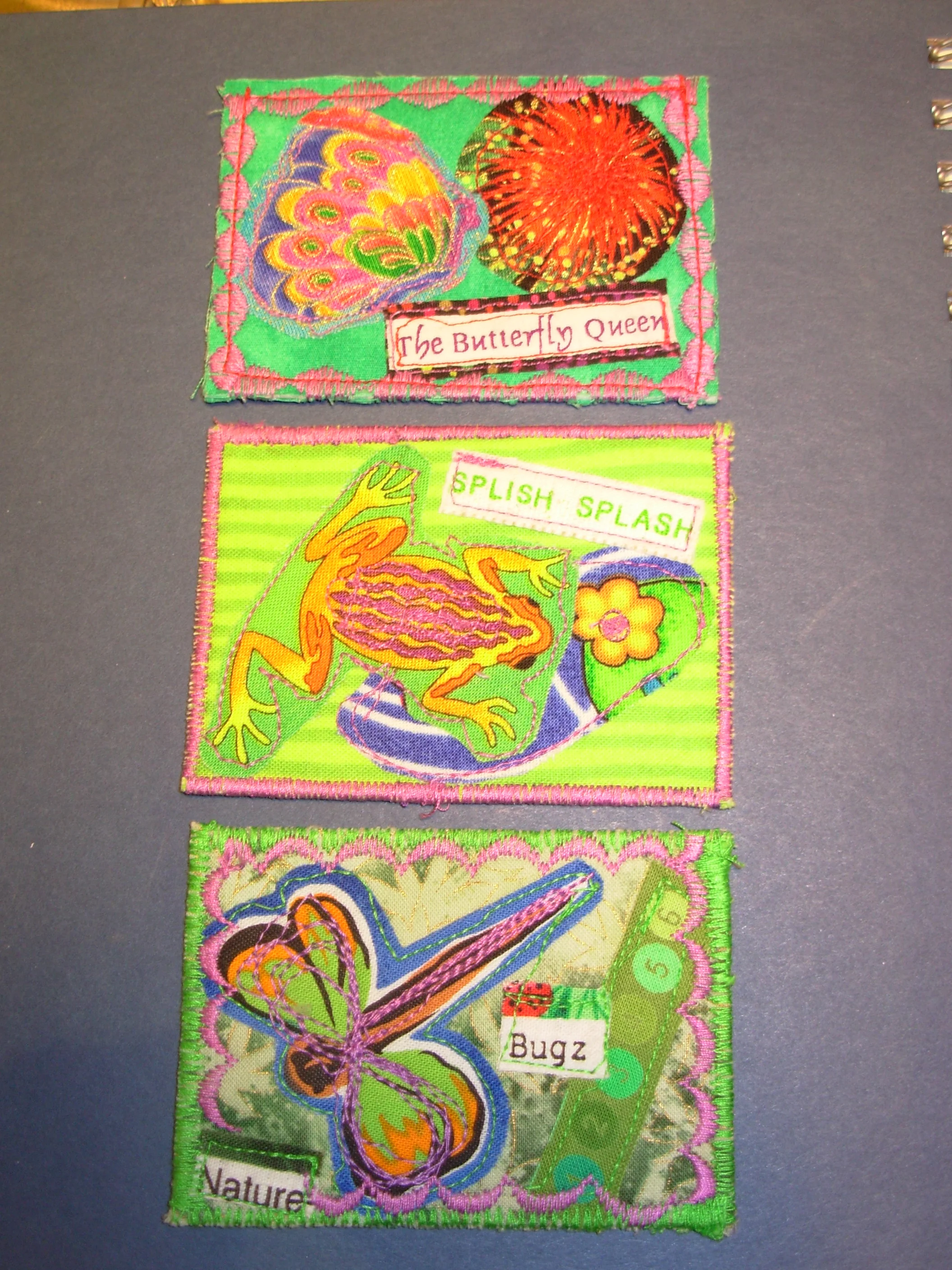 Tonight I decided to get a move on some ATC's I wanted to make and had so much fun with them that I also did two postcards. The ATC's (artist trading cards) are for an Imagination Tribe trade where the theme is Anything But Paper. I had been planning on trying these for a while. These are fantastic for using up tiny pieces of fabrics so I got out my copious bags of scraps and got to work. After making the ATC's I thought a tutorial would be in order so I did that with a postcard. The tutorial follows these photos of the ATC's.