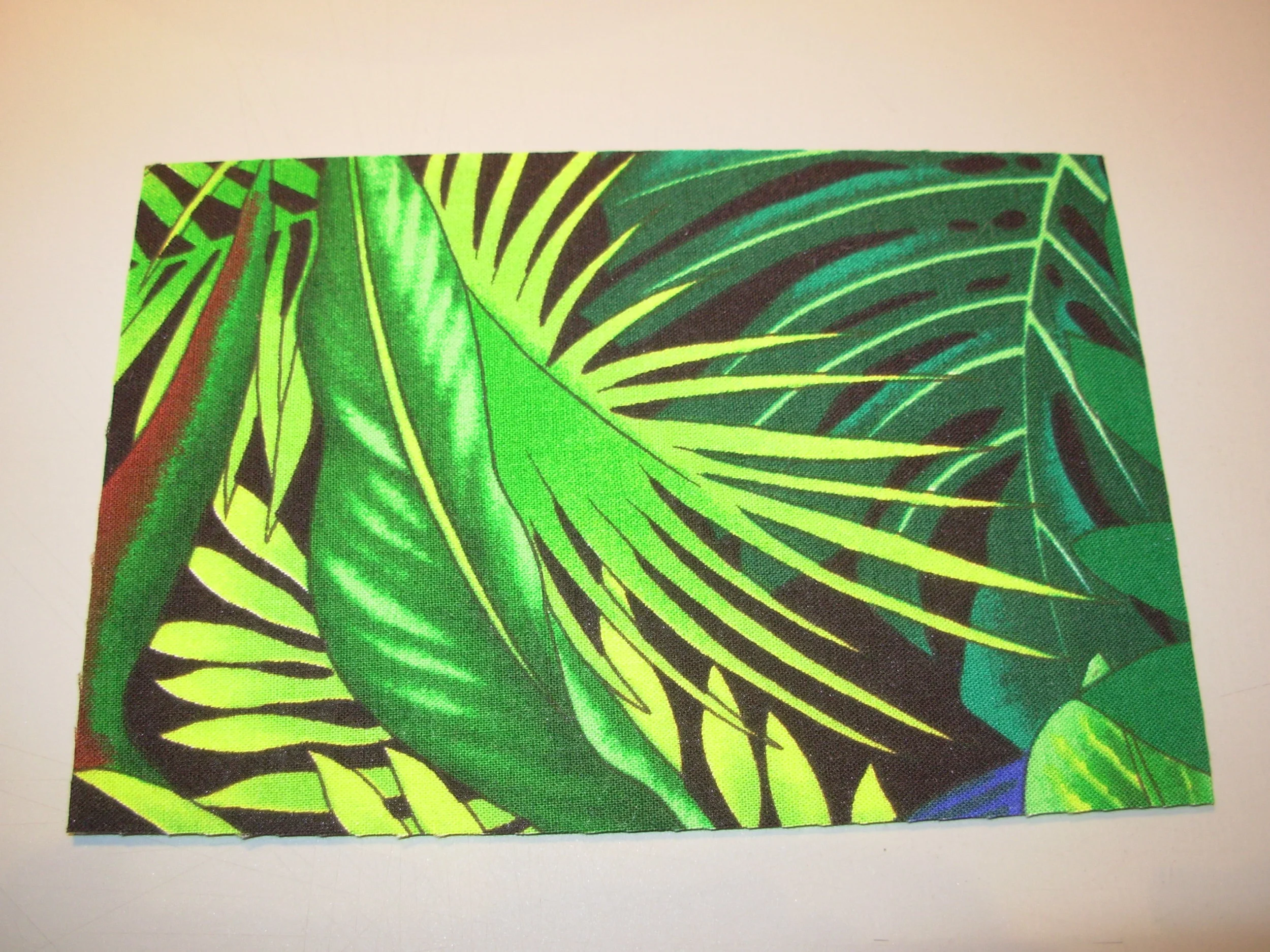 Now, I picked out a fabric for the back of the postcard. I discovered that the threads on the back showed through so I did a double backing on them. First I fused a piece of muslin to the back. Remember, you've already removed the plastic backing so it's ready to fuse. The fabric was cut a little big, then after fusing trimmed to the exact size of the card.