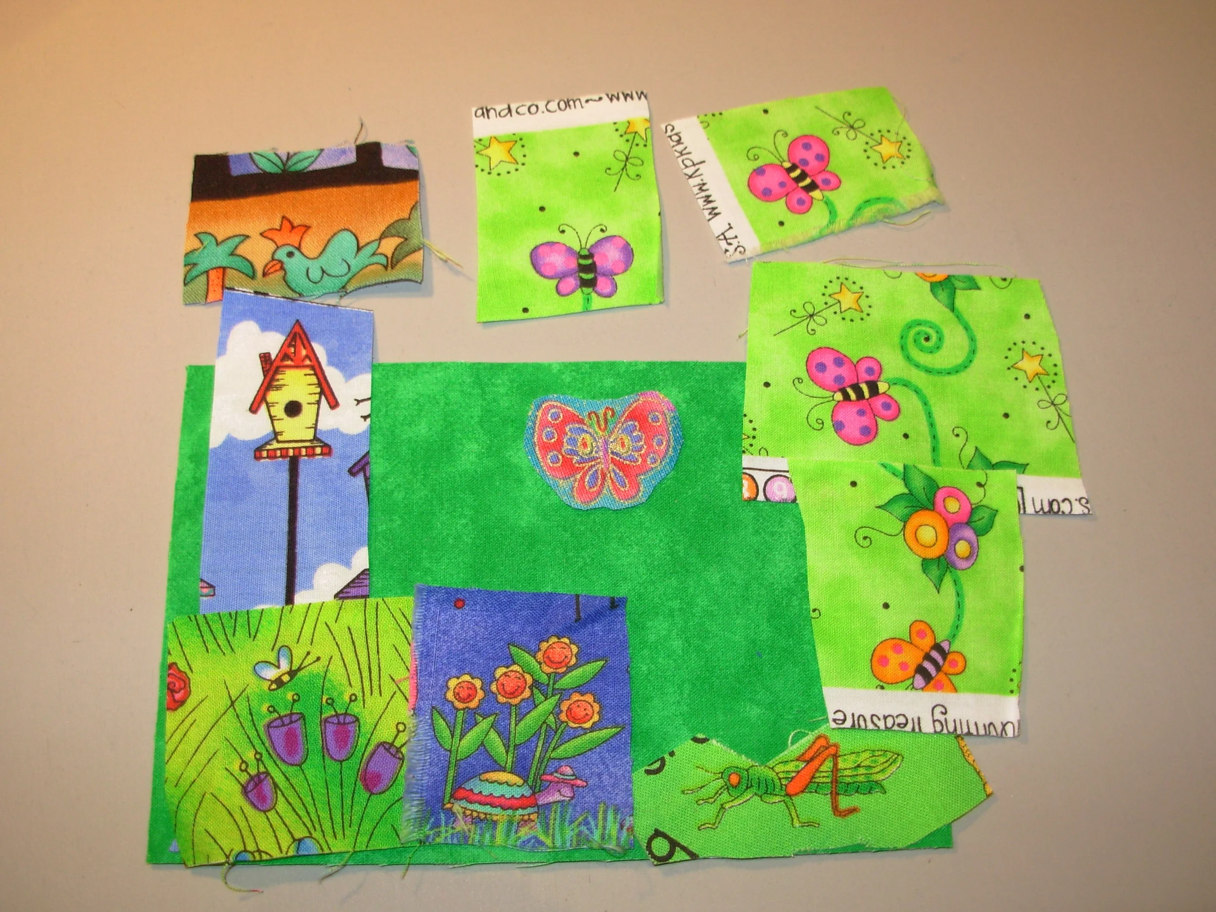 Next I found some bits of fabric to decorate the front of the card. I cut them roughly into squared off pieces so it would be easier to fuse them.