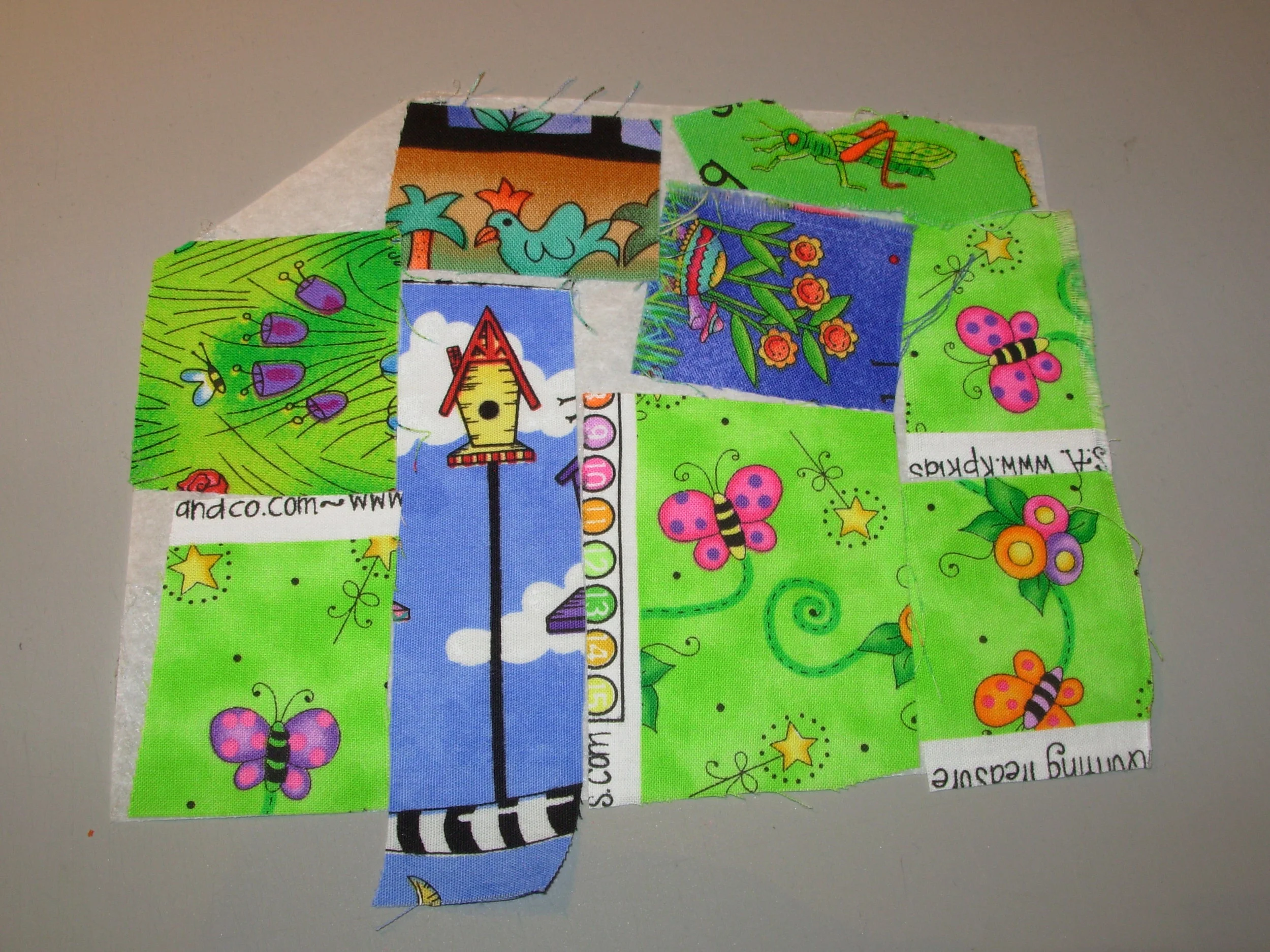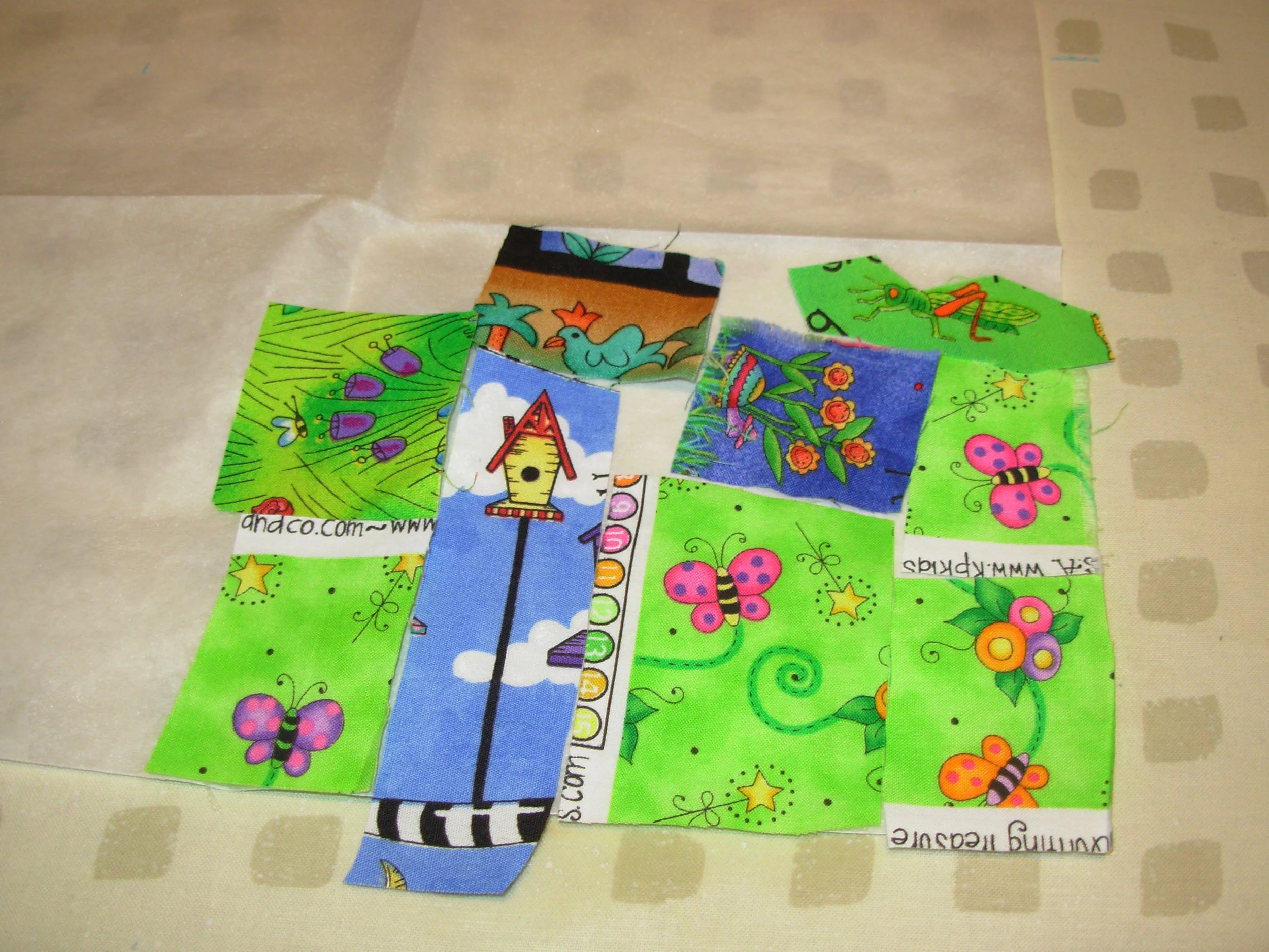 Here they are laid out right side up on the fusible side of the Wonder Under. I just put them together so the sides are touching. It doesn't have to be perfect, but you don't want to have areas of fusible web showing between the pieces.