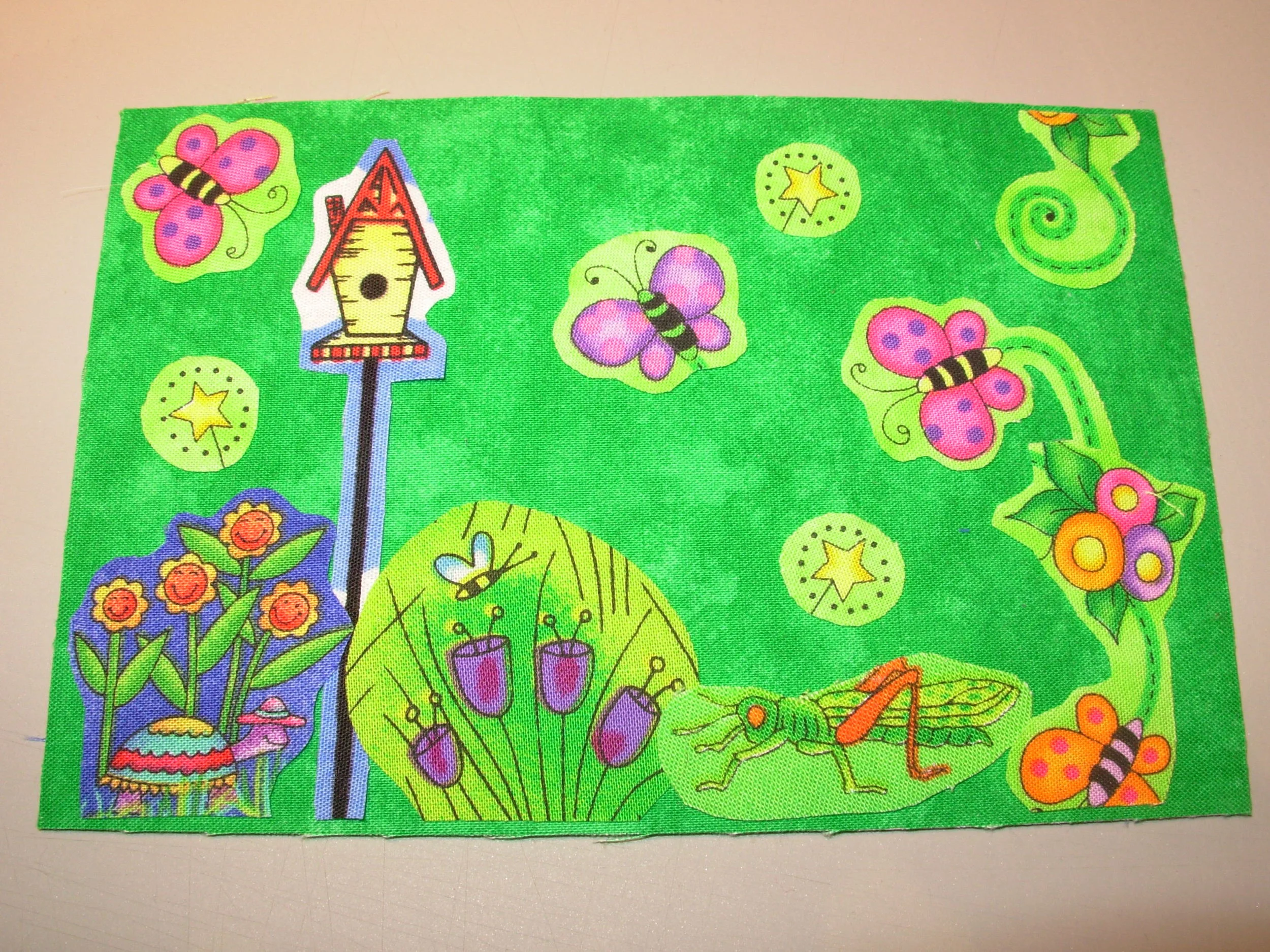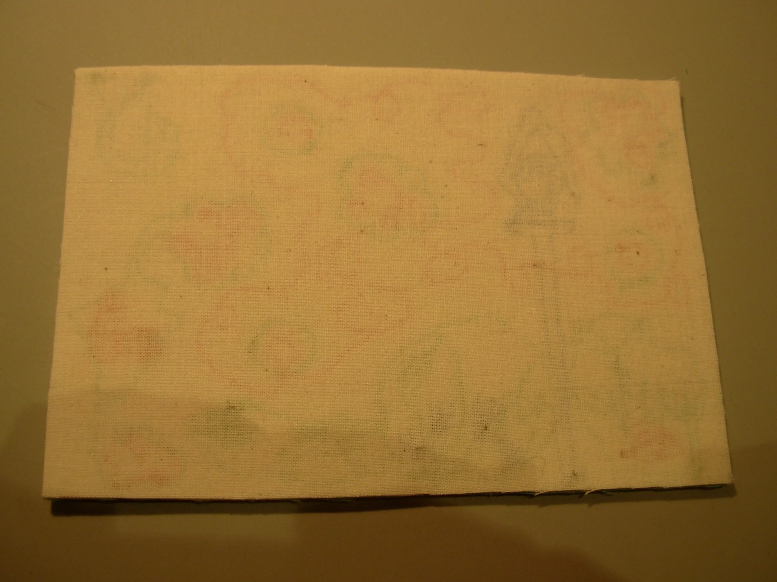 Then I chose a background fabric cut slightly larger than the card and fused it to the un-papered side. I cut it to the edges of the interfacing after fusing. I just realized that I have mixed photos of the two different cards I did. This is actually the background for the second one, so the rest of these photos will show the first card.