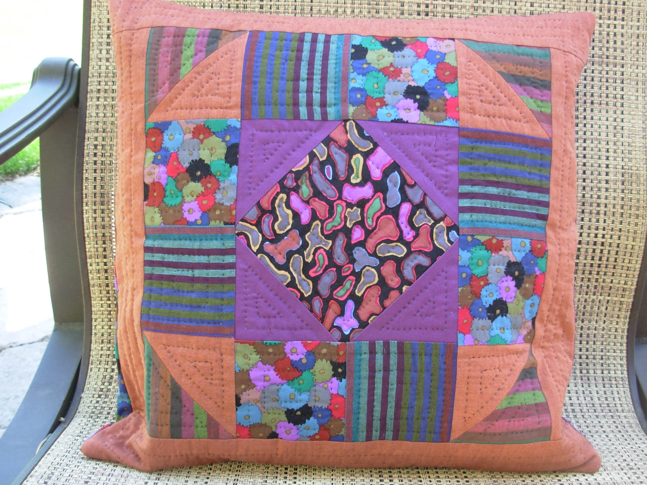 I got these three pillows finished the other day. They had been sitting around in various stages of quilting which I finished this week. When I was sewing them up I decided to take some photos to illustrate my technique. There are probably lots of ways to do this, but this is my favorite. These are 16" pillows and the block pattern is from the book, Fat Quarters are Beautiful. In the book the pillows are not quilted. I wanted them quilted and wanted them bigger so I took the 12" block and added borders to make the whole top about 18". I layered it with batting and muslin and quilted free hand. After I did the quilting I trimmed the top down to 17" so I would have a 1/2" seam allowance.