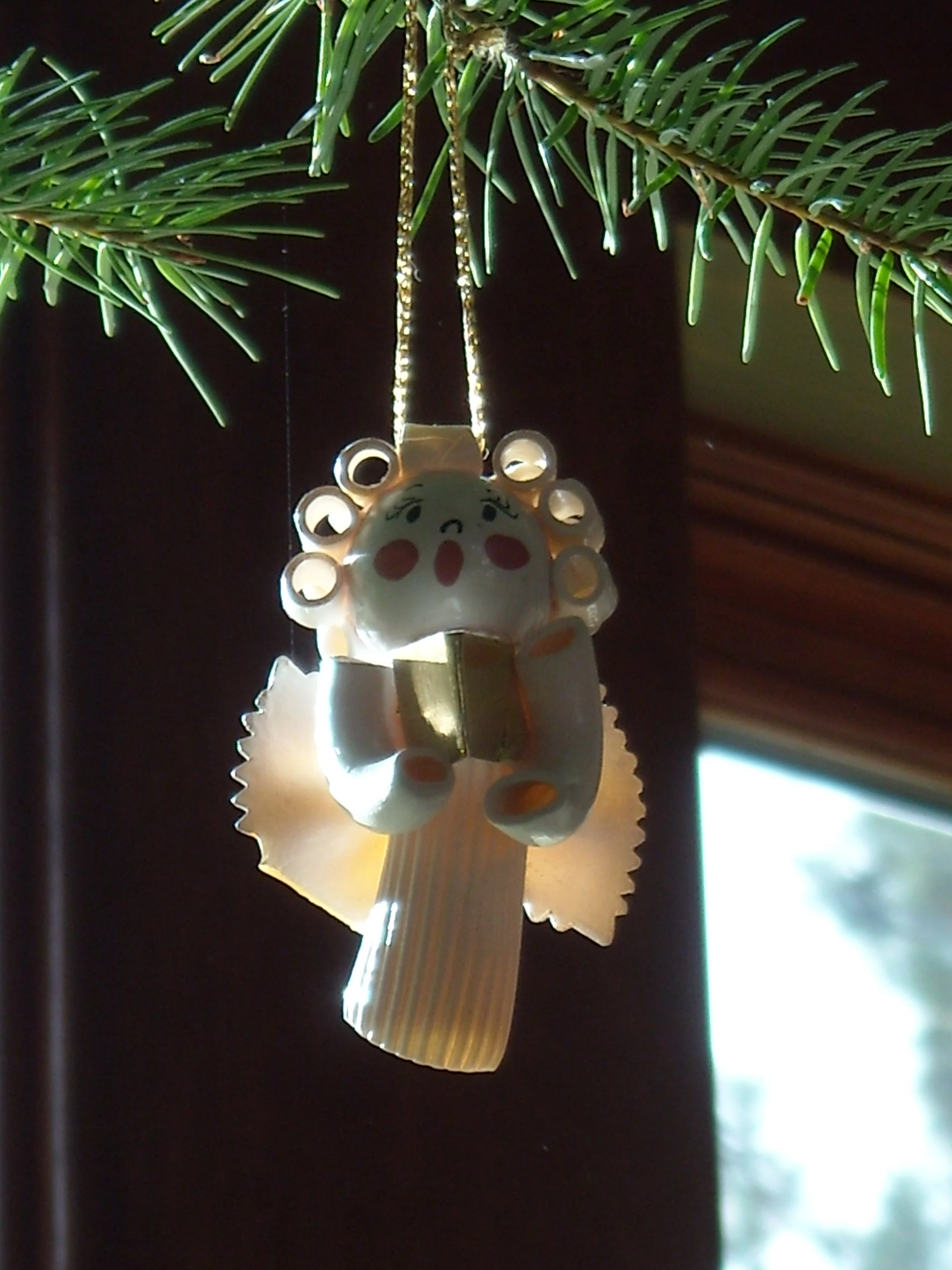 Macaroni Angel made by my mom. These have suffered from attrition over the years. I think this is the only one we have left.