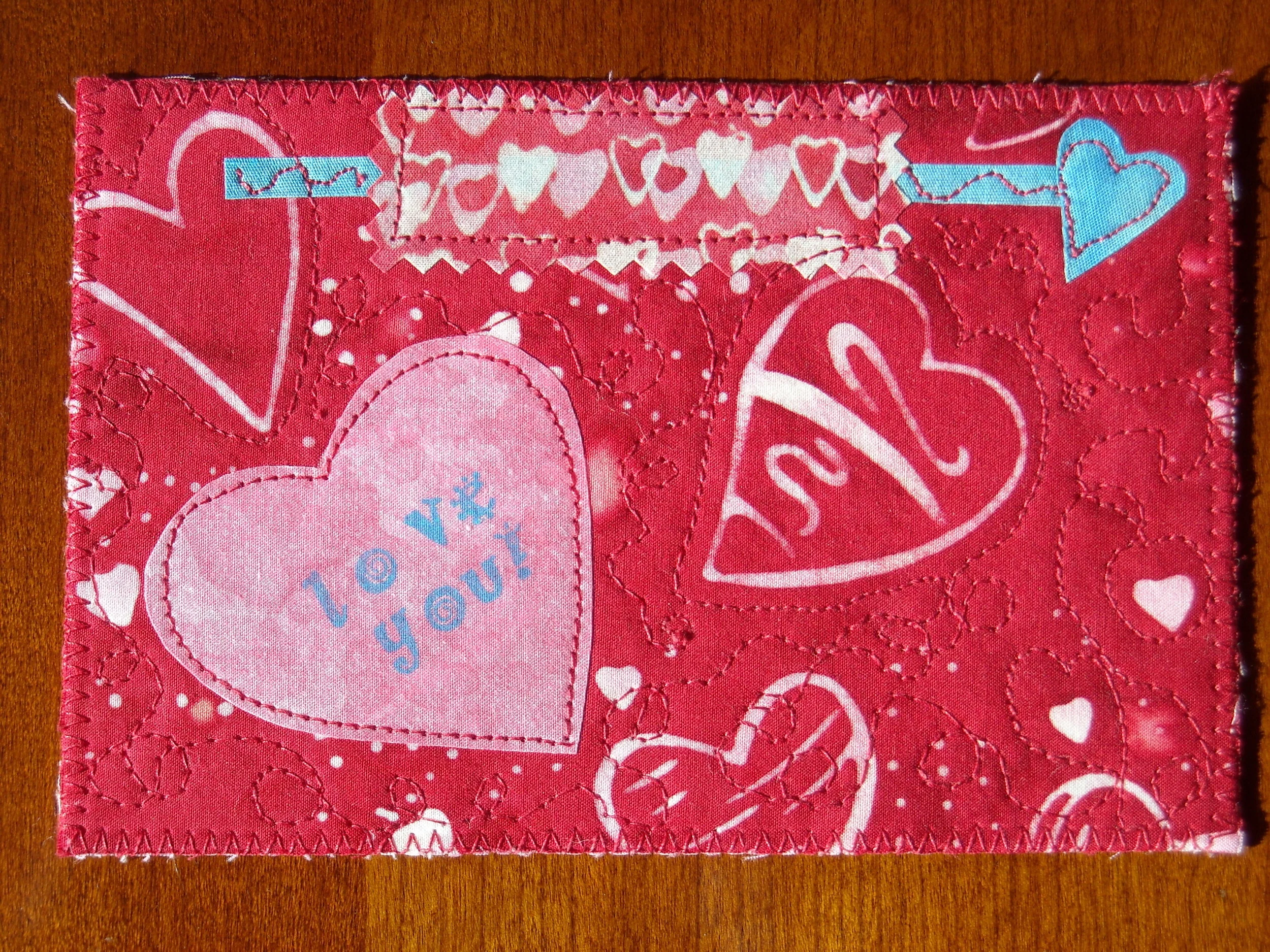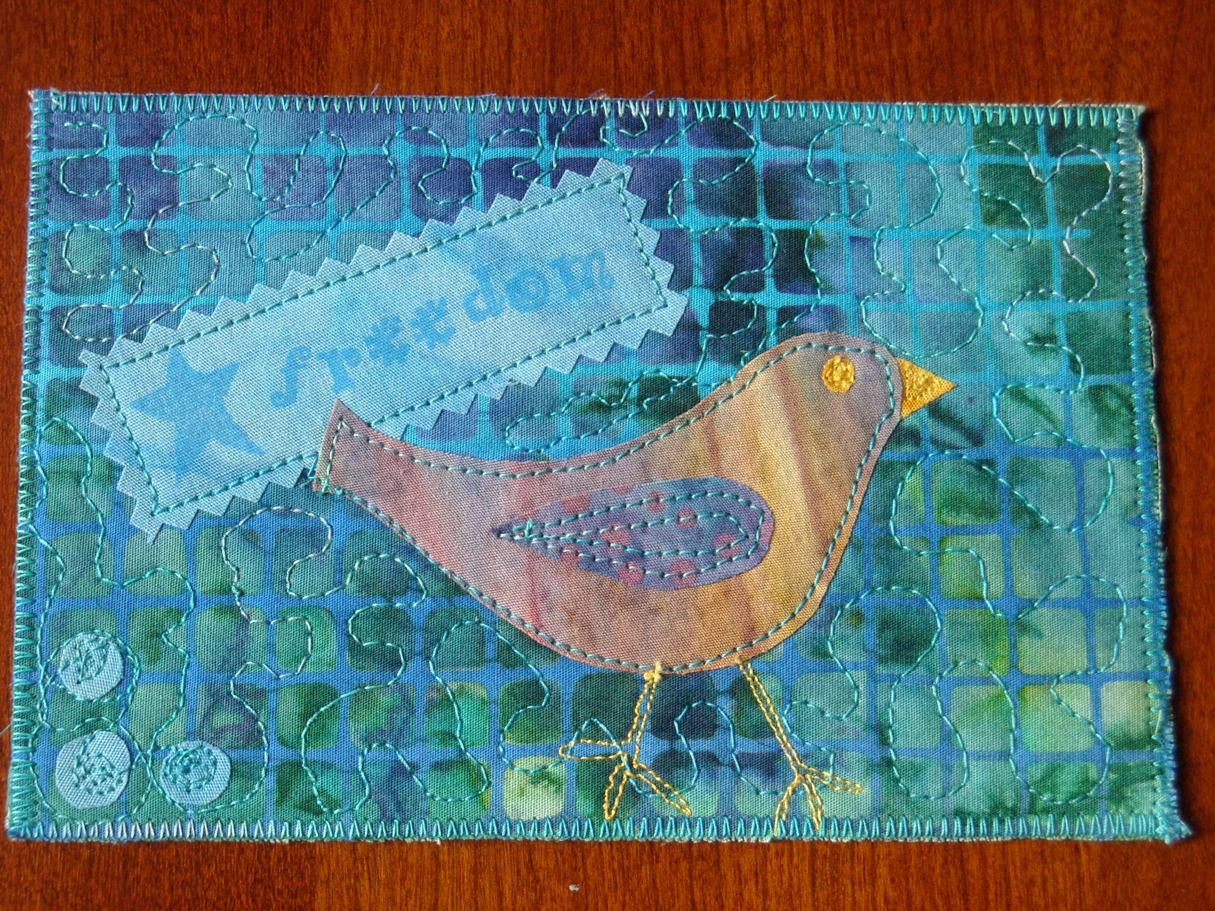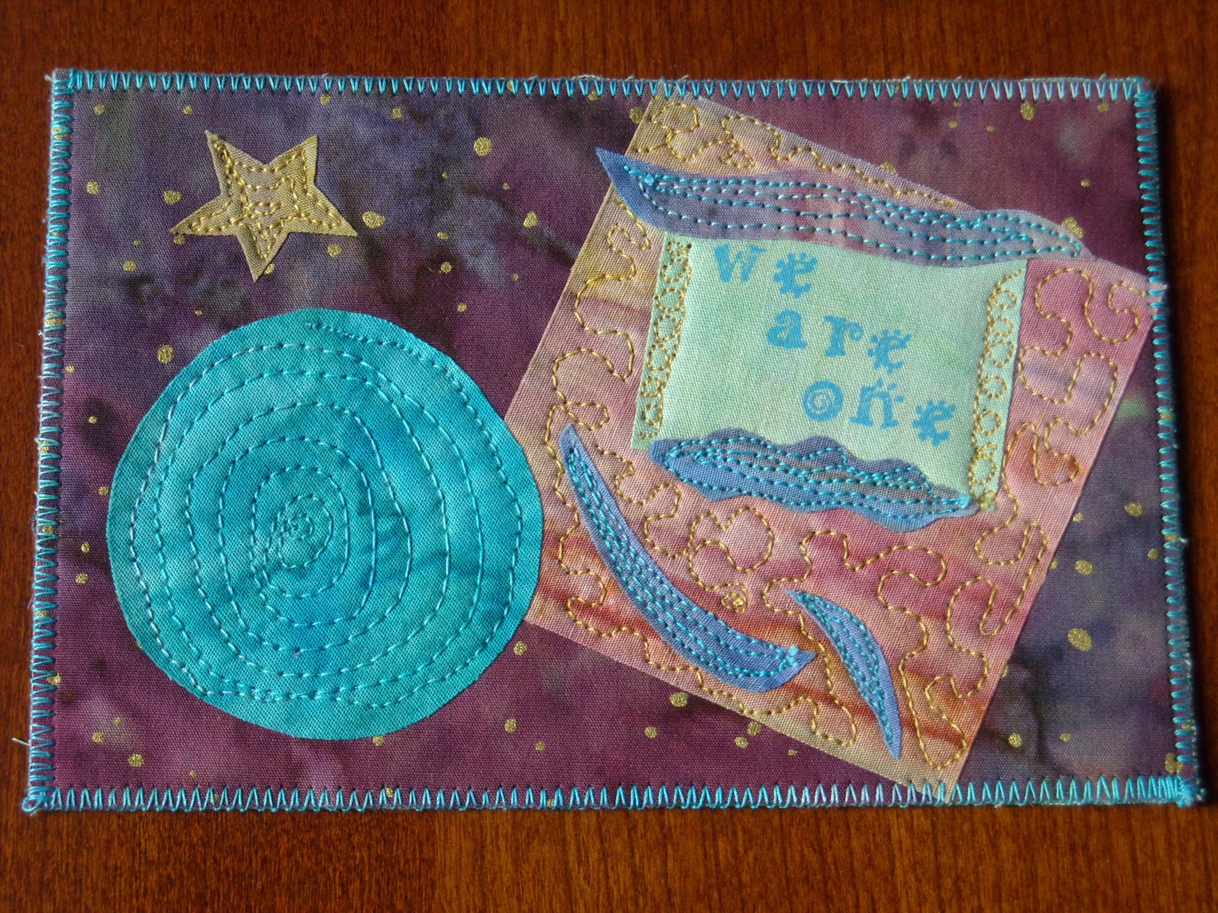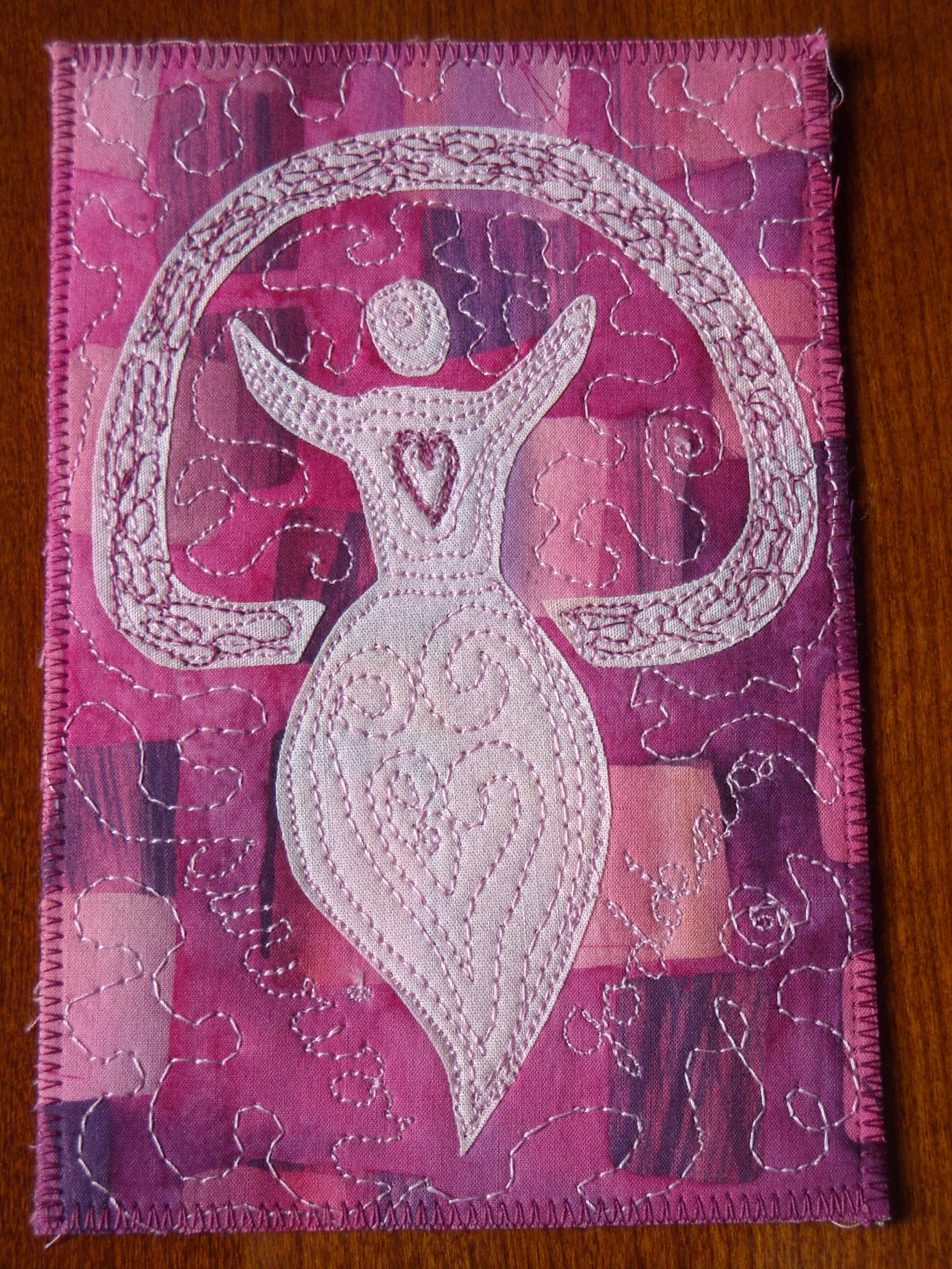 I mentioned in the last post that these postcards are for the Wish Upon a Card project for the Sisters Quilt Show this summer. Since the proceeds will be going to a cancer charity in my home town (the very place I will be receiving radiation treatments in a couple of weeks), I decided at least one card had to have a breast cancer theme. This one is Survivor Goddess and is based on the hand carved stamps I made for the Art for Cures breast cancer swap. This is the first time I've tried to write with free motion stitching. It was kind of fun, but there's room for improvement! Luckily, these postcards are giving me lots of practice with the free motion quilting.