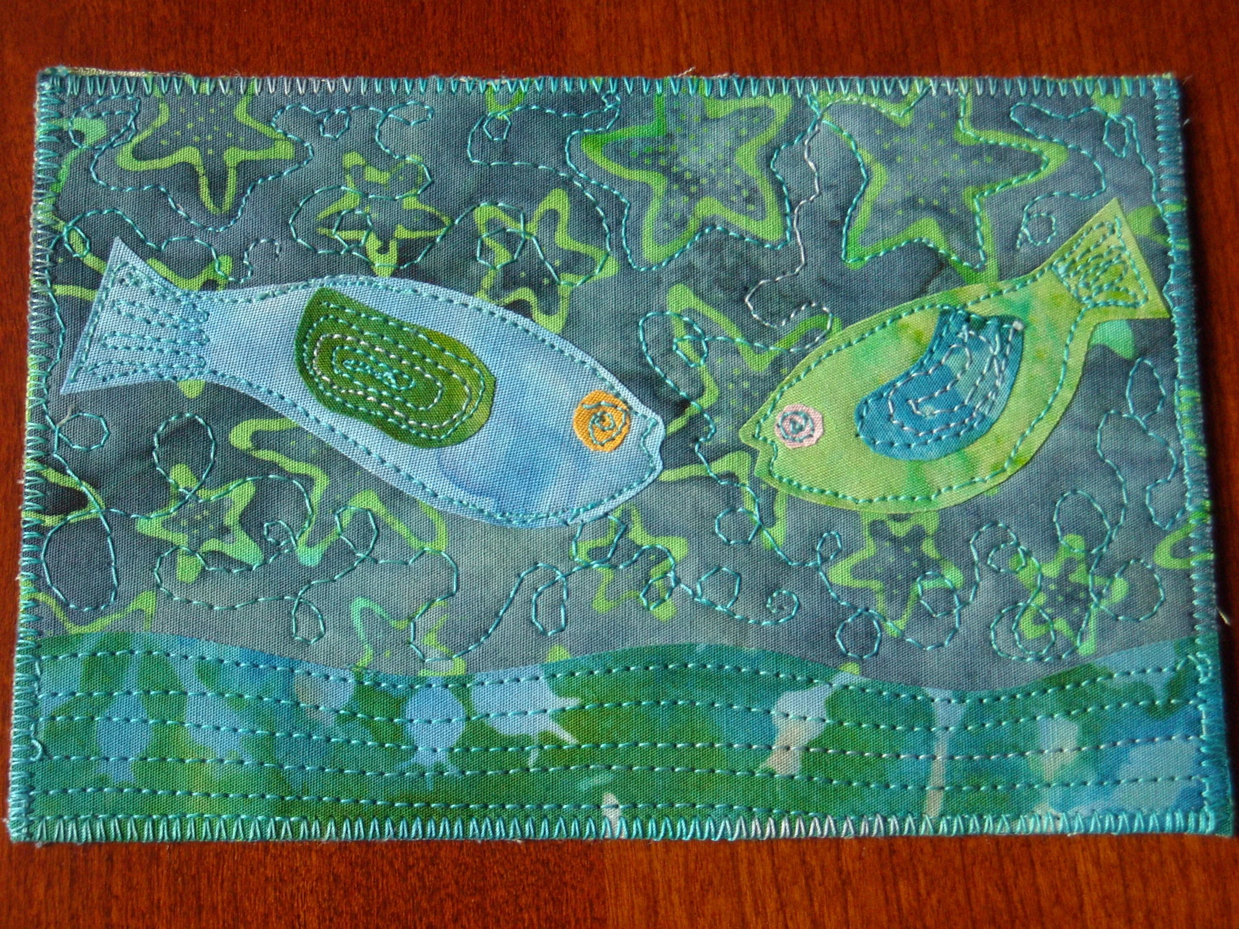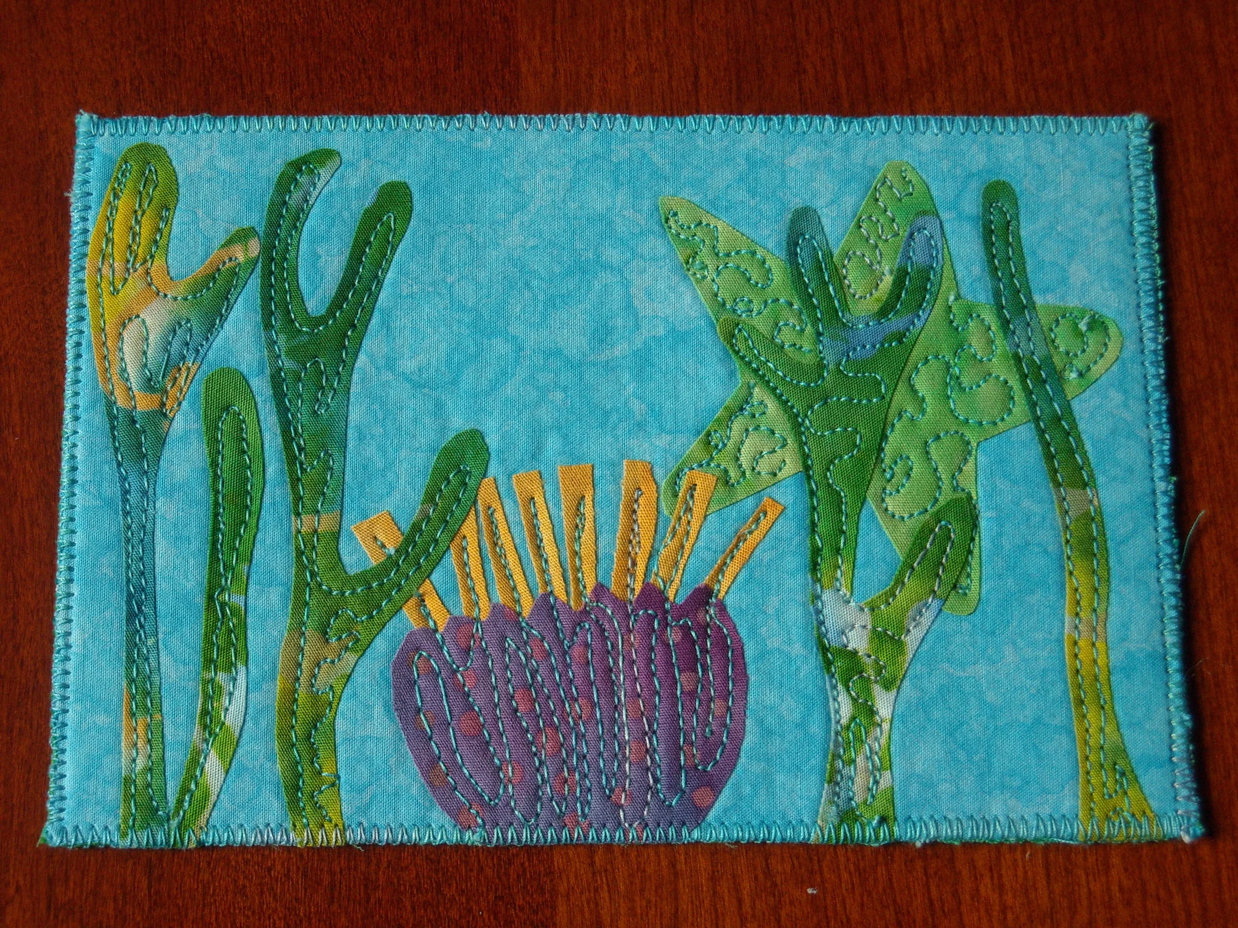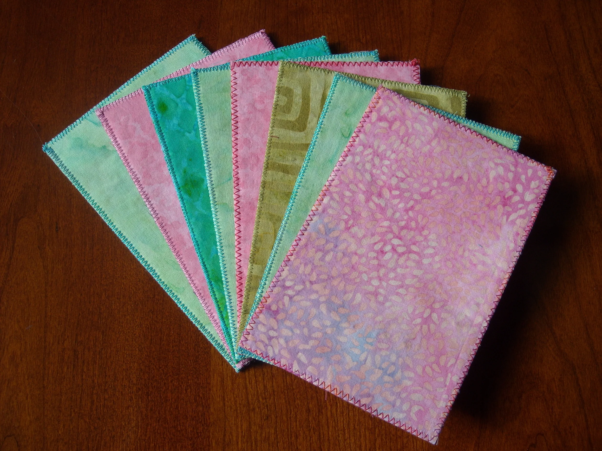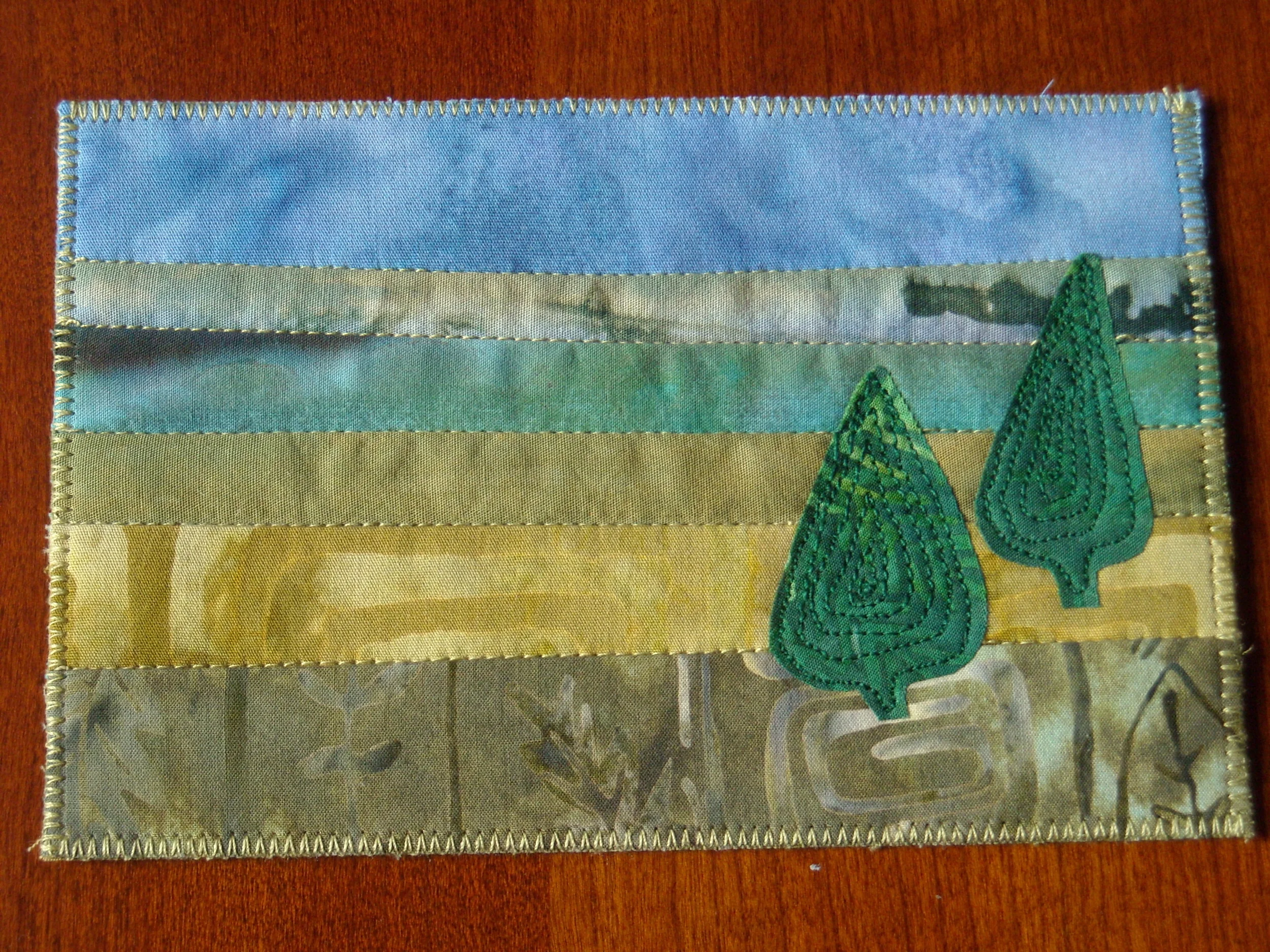 I ended up making 8 postcards, all from my batik stash. I love my batiks, but discovered a few years ago that I can't hand quilt through them, so almost stopped using them. I decided to reserve them for machine quilting, but these postcards are a perfect use of them. Actually, getting out all those gorgeous fabrics again makes me want to make a quilt with them! Anyway, the first seven were fused pieces on a single background fabric.