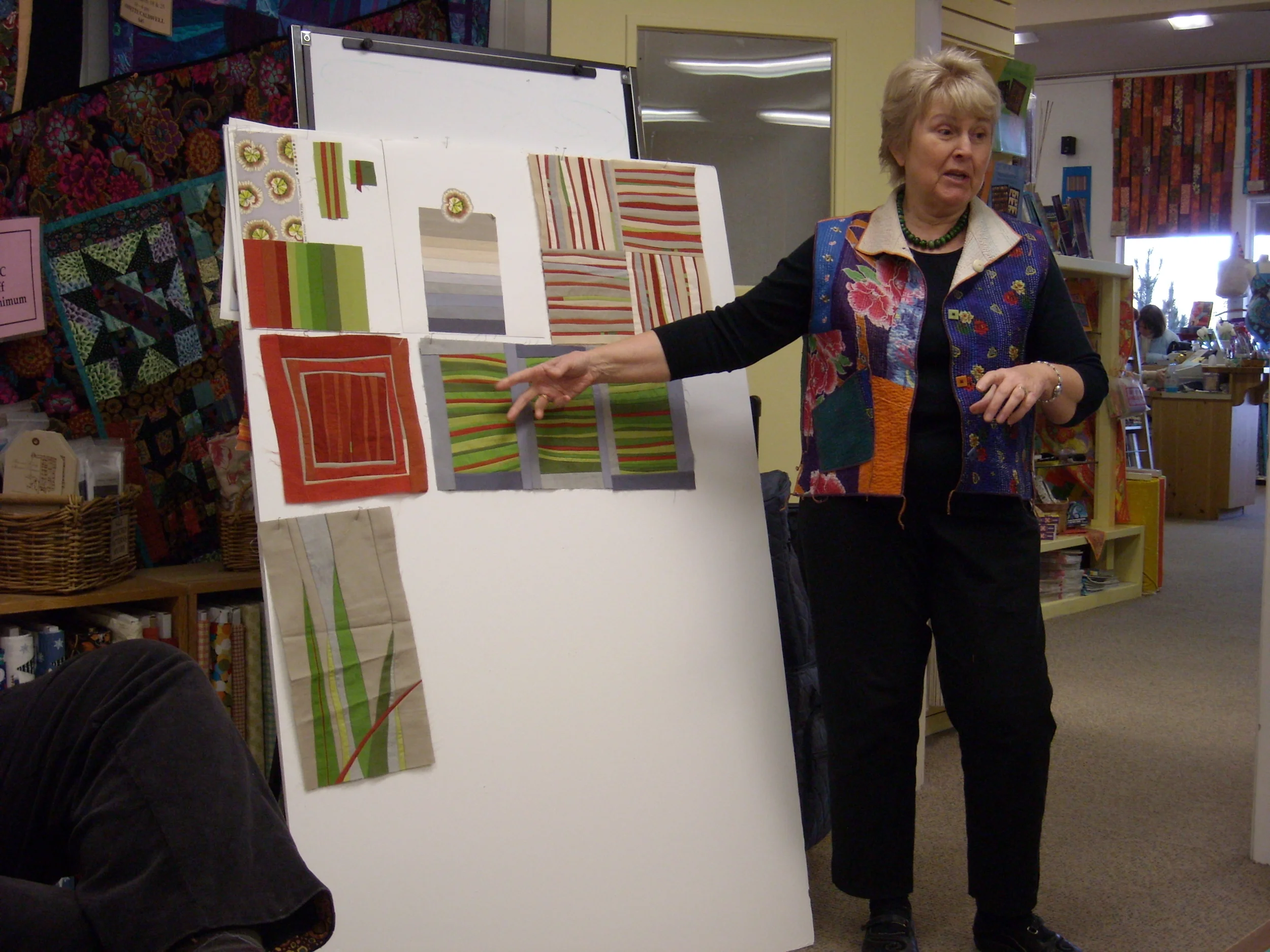 Jean took a class with Nancy Crow several years ago and that's when she started working this way. One of the assignments she had in that class was to work in black and white and that was the ultimate test. Taking quilting right down to the bare bones. She showed a photo of the black and white study she did (I don't think it was ever sewn together) and it was quite striking. She thought it reminded her of a nearby burned forest area in the snow. Blackened trees against a field of white.