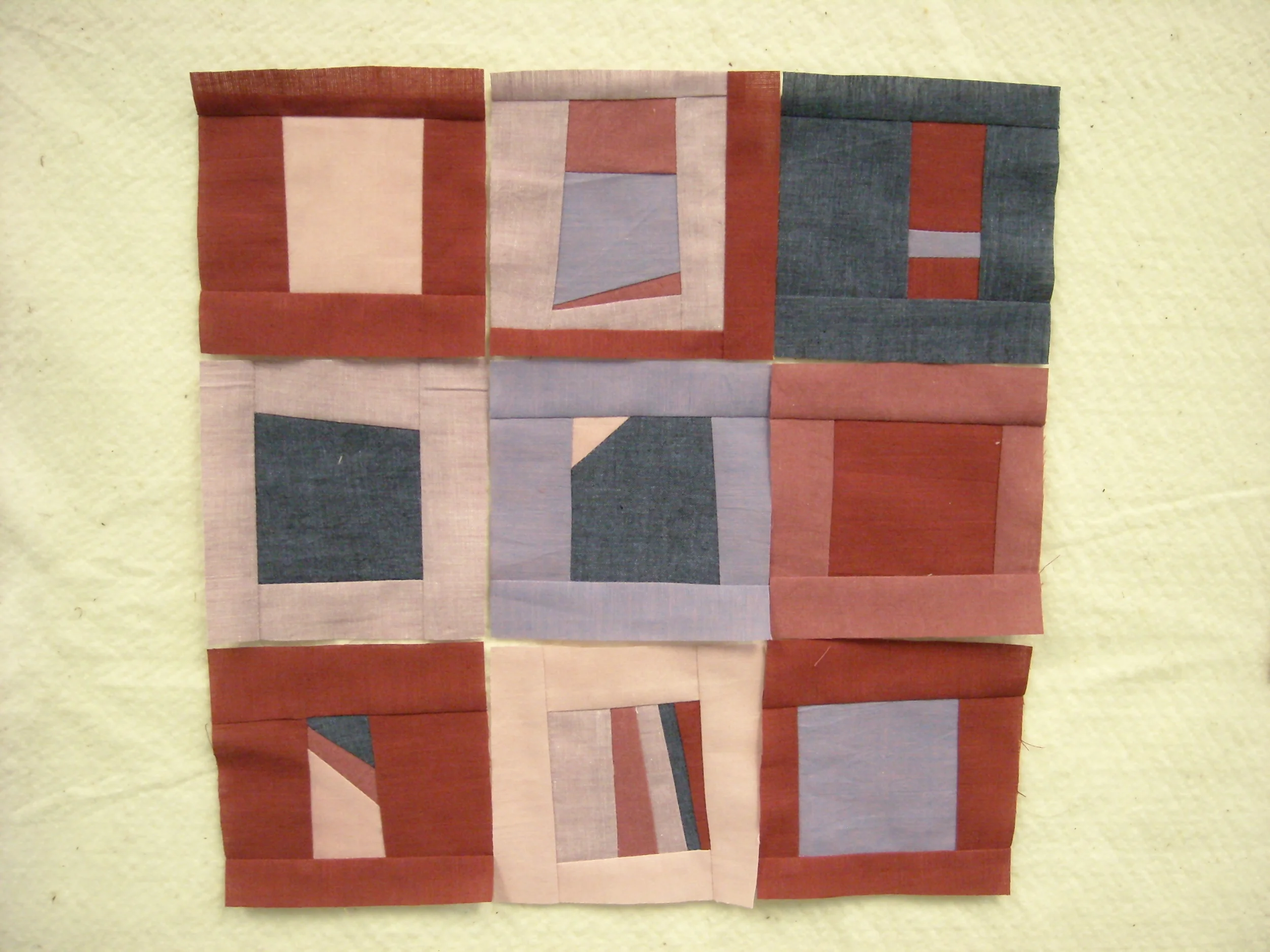 Our first task was to randomly select 5 strips of fabric from a stack that she supplied. I was the last one there, so I got the dregs. These are not my favorite colors, but I had to make do. We arranged them according to what we thought was a value gradation. Then Jean brought out the red plastic value finder. I have known about these things for years, but never tried one. It really was quite amazing to see how we all had our fabrics in the wrong order. Once we figured out the true value gradations we were to make these free pieced squares. We had to combine the values in different ways such as light center, dark border; dark center, medium border. After making 4 of those we made the rest in whatever fashion we wanted. Now, this is my kind of piecing. I had lots of fun with these and it went quickly. I think I'll probably finish this into a mini quilt sometime.