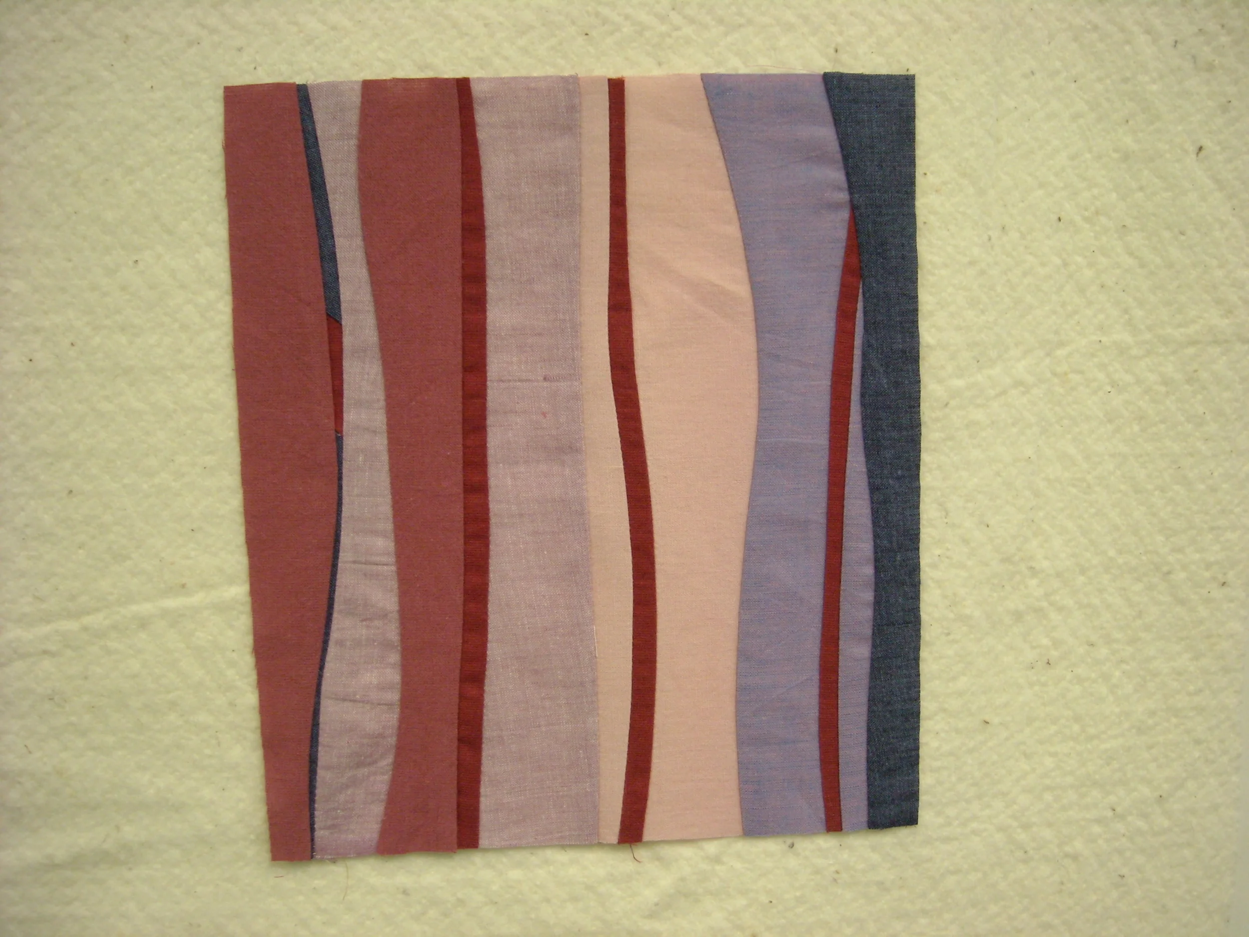 Next, Jean showed us how to do these gentle curves. I had tried this technique last year with great results. One thing that was new to me was the technique for adding the really skinny strips. If you click on the photo above you can see the little blue strip on the left and the tiny red piece inserted in it. That was fun to do.