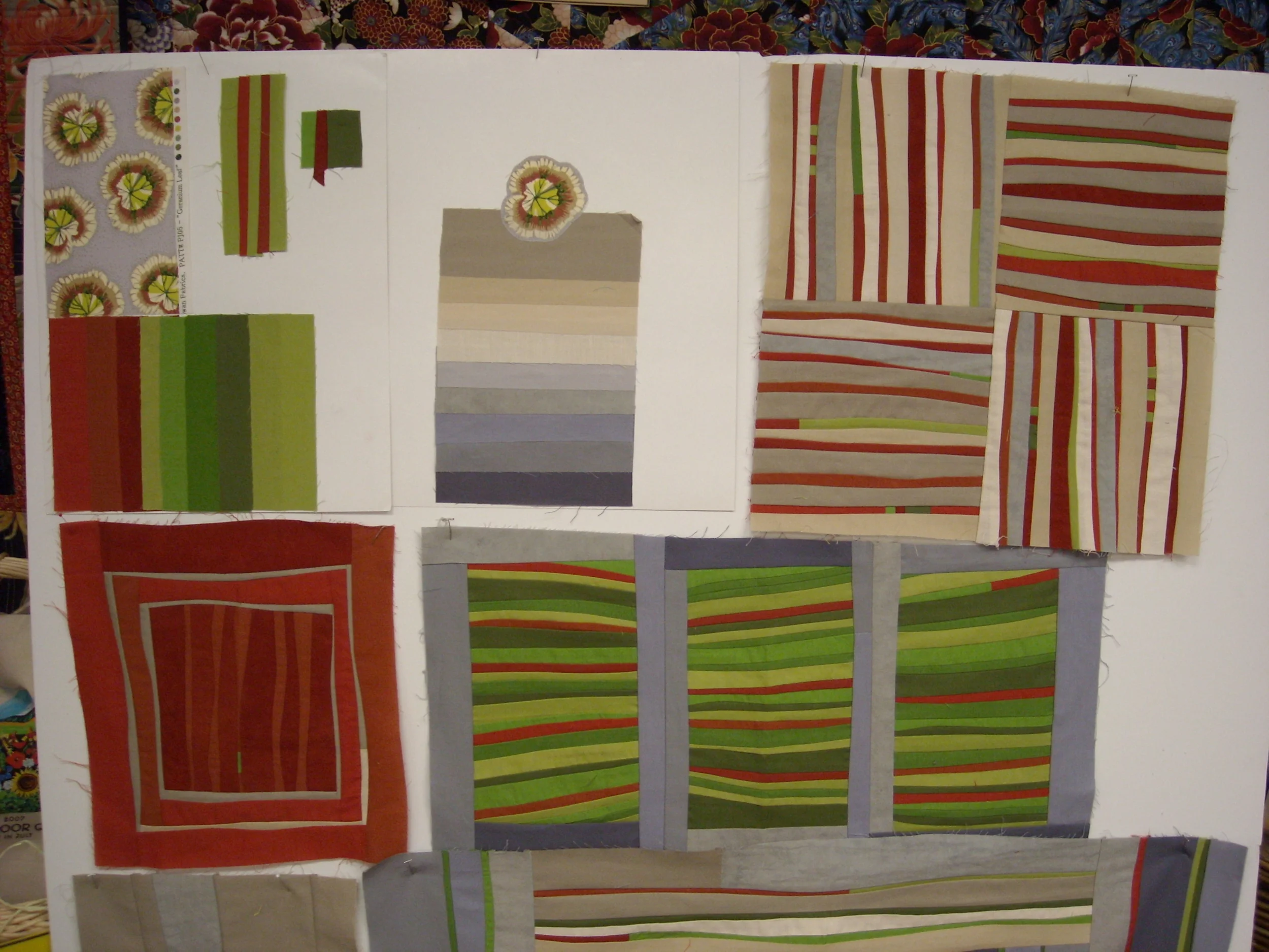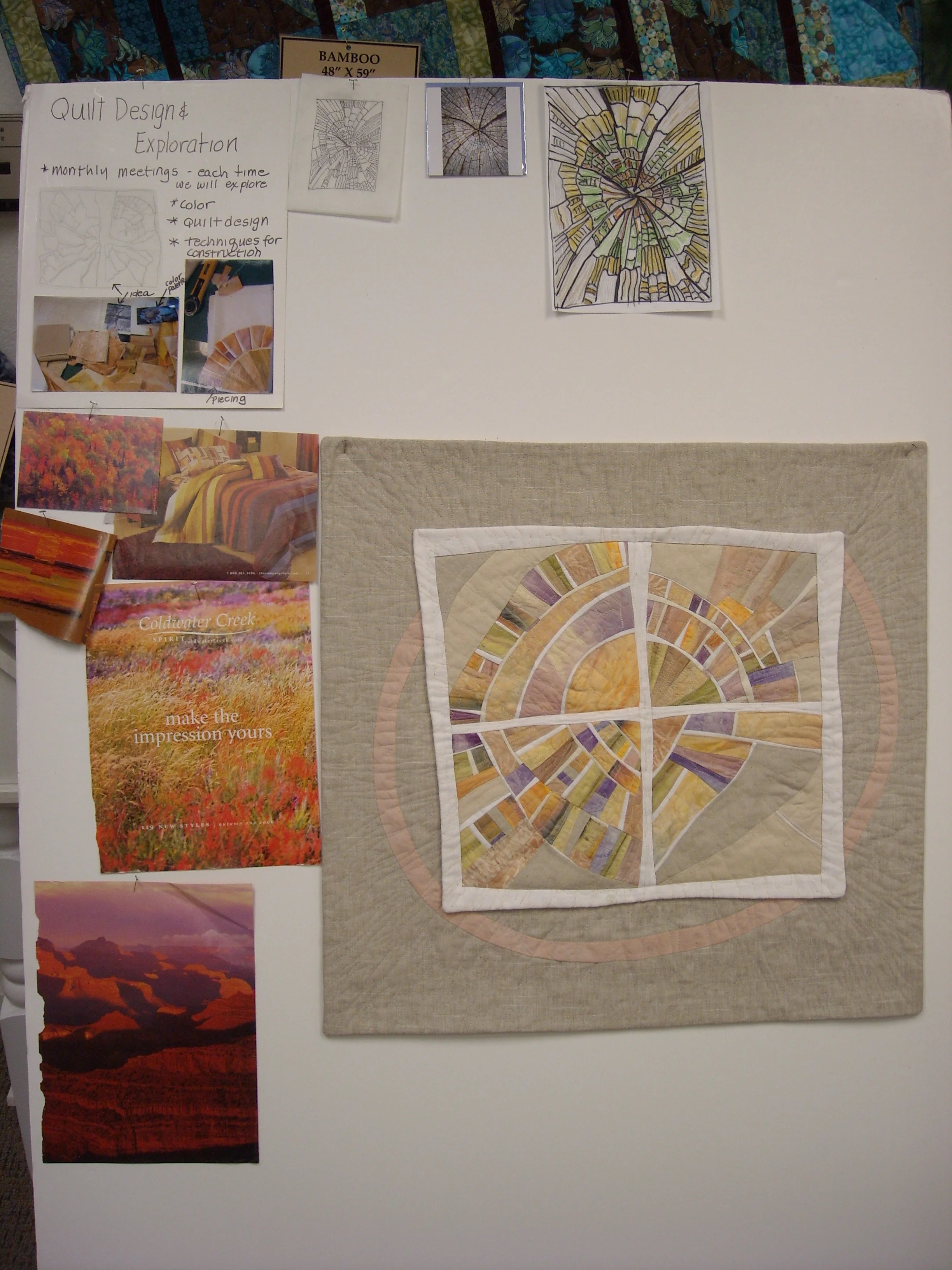 Next she talked about her method of designing a larger quilt based on a sawed off tree trunk. She had the photo and to provide the color she went to all the clippings you see here on the left side. The mini quilt is a smaller study to prepare for the larger quilt. This one was not free pieced because she wanted it to look exactly like the tracing she did of the photo (upper right).