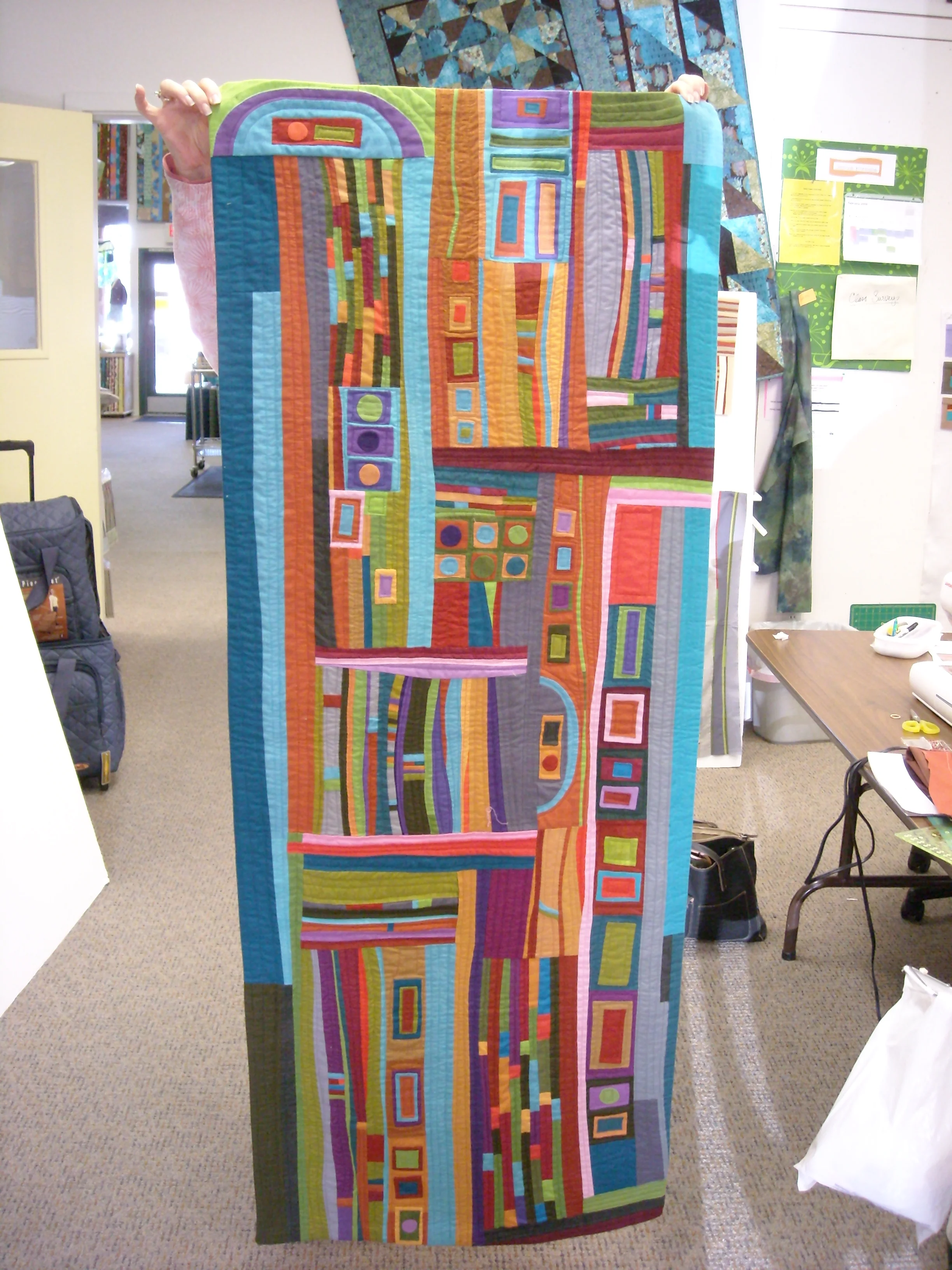The last thing we discussed was how to finish a quilt with asymmetrical edges. I like this facing technique and will be giving it a try sometime soon. I think it's the same idea as what is presented in the Art Quilt Workbook, but I didn't understand how it worked until seeing it in person. Jean also showed us some really great free motion quilting samples that gave me some ideas. It was an exhilarating class that left my mind reeling. I have so many WIP's right now that I'm feeling overwhelmed. Luckily, I got the beading done on Chloe's quilt today and have only to add the sleeve. Photos to come soon!