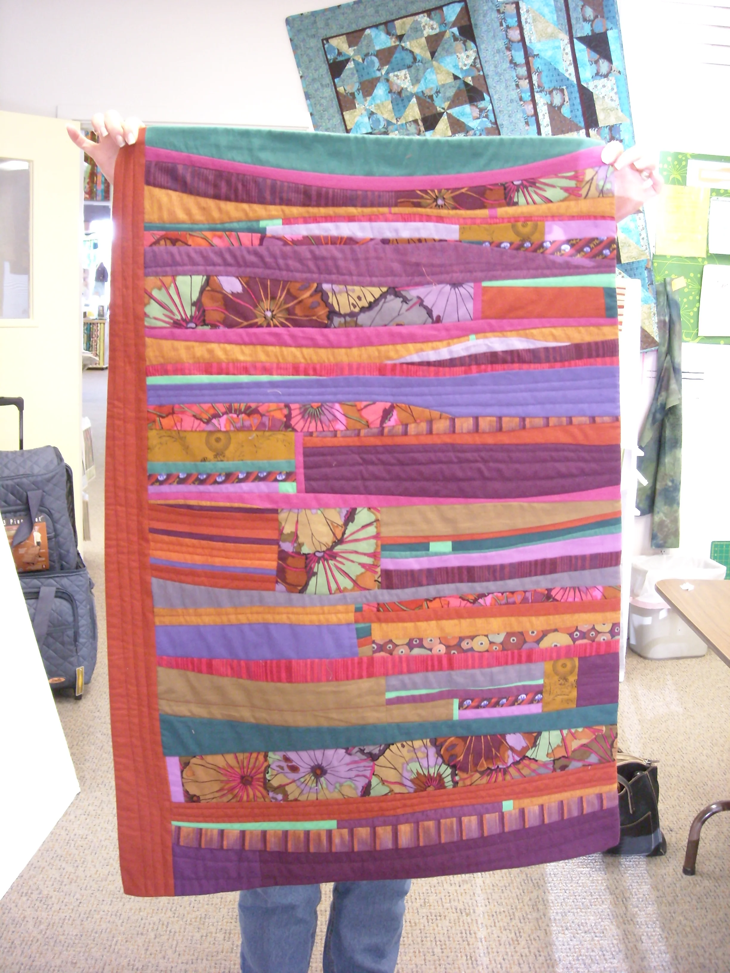 I got some photos of some other quilts done in the free pieced style. I really love these and the colors are so inspirational, though the photos don't do them justice. I like the subtle curves and surprising little bits of color. This one is all solids which makes me really want to just focus on color this way and not have to worry about pattern.