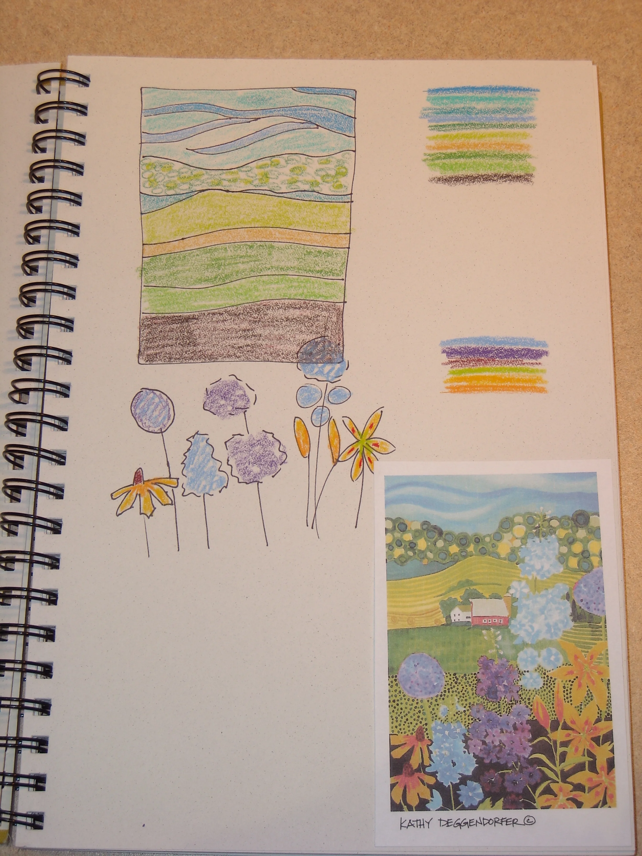 On the second day we were given free reign to try any of these techniques. I decided to develop a page in my brand new design notebook, courtesy of my sister, and used a greeting card for inspiration. I chose this one for the colors and the design lines which would call for some curved piecing.